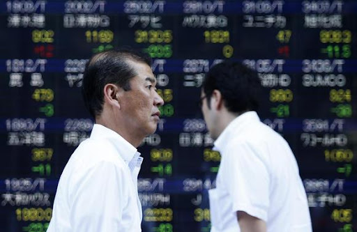 Pedestrians walk past an electronic board showing the various stock prices outside a brokerage in Tokyo August 6, 2014.