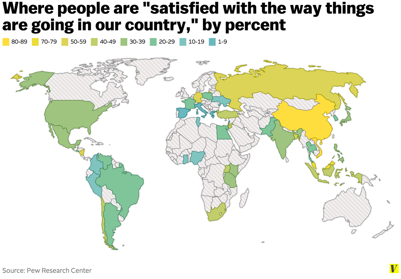 Pew asked people from 44 countries around the world whether they're satisfied or unsatisfied 'with the way things are going in our country.' The map below shows the results of Pew's survey. Notably, only in 17 of those 44 countries did the majority report being satisfied, marked in yellow; more unsatisfied countries are blue: