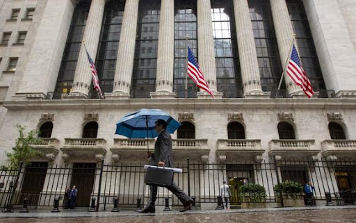 A man carries an umbrella in the rain as he passes the New York Stock Exchange October 16, 2014.