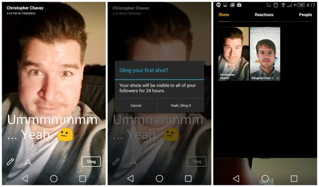 In an effort to keep you using Slingshot versus, say, your regular camera app, everything snapped inside Slingshot can be shared to Instagram, Facebook, Twitter, and more. In all seriousness, we love the layout, look, and ease of use of Slingshot over Snapchat. It's just getting people we know on the service that will prove the biggest challenge.