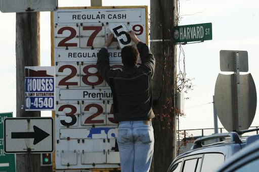 A man changes the price for a gallon of gasoline at a gas station in Medford, Massachusetts December 4, 2014.